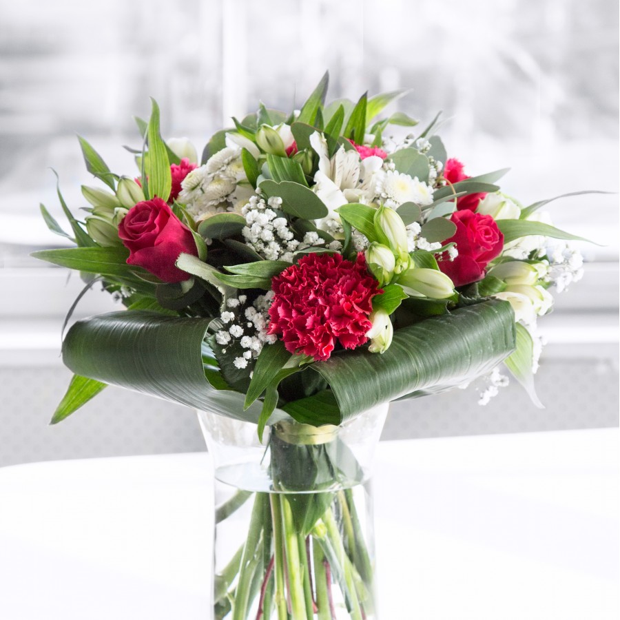 Indulge in the exceptional beauty and uniqueness of our exquisite bouquet. This arrangement features sweet white chrysanthemums and delicate gypsophila, paired with luxurious red roses and vibrant carnations. The elegant design is completed with white alstroemeria and lush aspidistra leaves, making it a perfect choice for any special occasion.